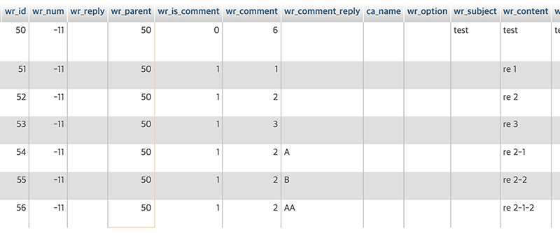 wr_comment_reply 에 A, B, AA 등의 형태로 step 에 맞게 알파벳이 추가되는 구조입니다