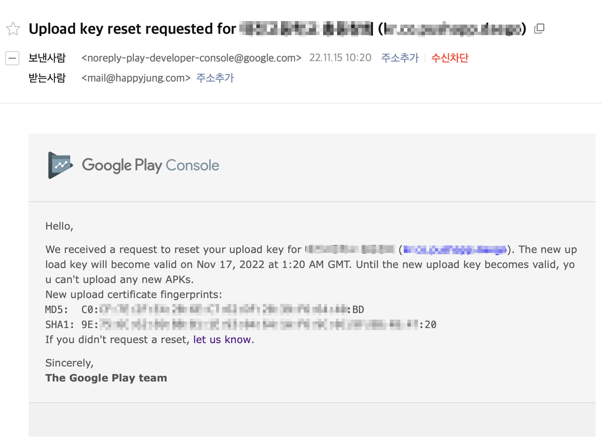 새 업로드 키가 유효해질 때까지 새 APK를 업로드할 수 없습니다.
