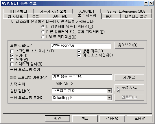 아래의 그림처럼 속성에서 홈 디렉터리로 이동하신 후 구성을 클릭해 보시면 응용 프로그램 구성창이 뜹니다.