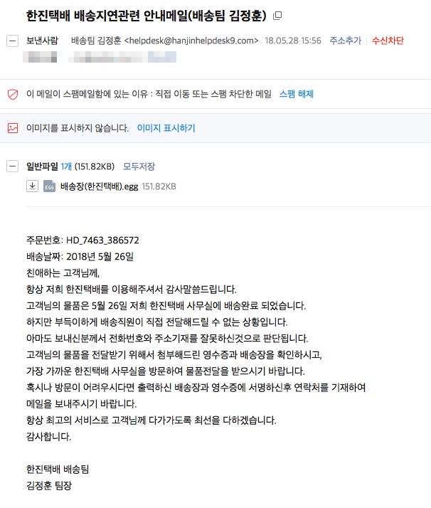 메일제목 : 한진택배 배송지연관련 안내메일(배송팀 김정훈)